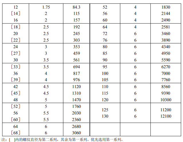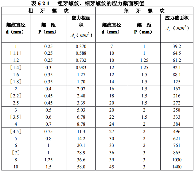 粗牙螺紋 M1~M68(GB1 93)、細(xì)牙螺紋 M8×1~M1 30×6(GB1 93)的應(yīng)力截面積( As)值 ,如表 6-2-1 所示。